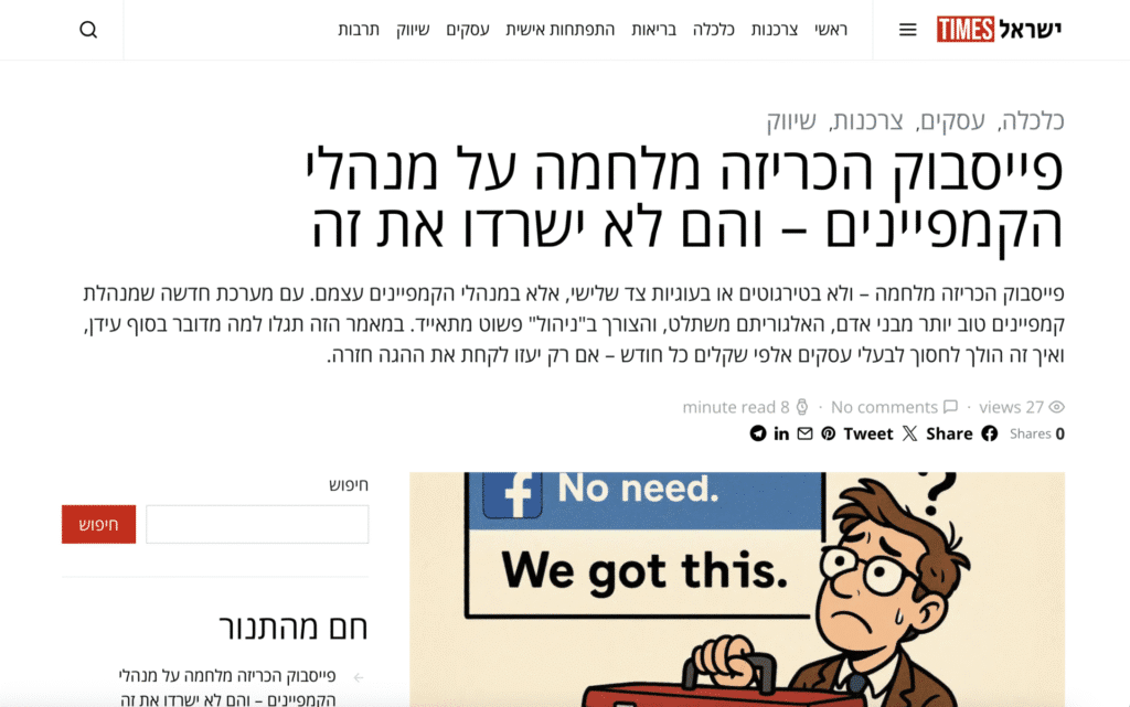 אבל בקצרה… האלגוריתם של מטה (פייסבוק ואינסטגרם) כל כך חזק היום שאין צורך ב־"ניהול הקמפיין". הניסיון מראה שהגדרות פשוטות ומינימום התעסקות, מובילות לתוצאות הטובות ביותר – בתנאי שהמודעות בנויות כמו שצריך.